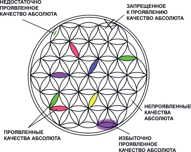 Все части Абсолюта (Души) являются одинаково потенциальными, то есть с равным количеством потенциальных качеств, но набор проявленных активных свойств у каждой Сути (Души) индивидуальный. Количество активных проявленных качеств уменьшается с понижением иерархического уровня Душ. Это хорошо показано на рисунках 2 и 3. Количество закрашенных лепестков уменьшается с понижением уровня Души.