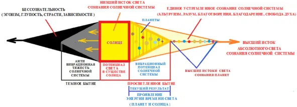 В реальности, как уже раскрывалось в главах выше (в первом томе теории), если вывернуть ложную модель наизнанку (наоборот), то единичные энергии Света (планеты) устремляемы свободным потенциалом Солнца (зеркальной защитой, зеркальным экраном) к Единому Высшему Истоку Абсолютного Света системы: условно – к центру сферы. В реальности – это восходящая к Единому Истоку системы конусная спираль эволюционирующего Света, устремленного к состоянию Абсолютного Света: от Солнечной платформы (проявленного для нас Покрова Божьего, как и земная кора) – к Высшему Истоку системы.