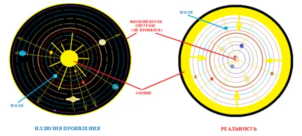 Визуально в восприятии человека образуется проявленная иллюзия, что планеты Солнечной системы вращаются по орбитам вокруг Солнца и к тому же притягиваются к нему. Это ложное представление сложилось по причине не знания Божественной сути всего.