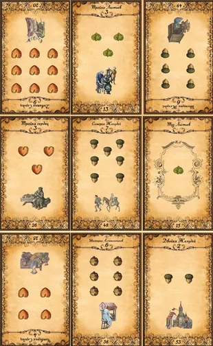 Последний ряд – тайные волнения клиентки – показывают ее желание видеть в делах мужчины успех, она волнуется и желает ему счастья и доходов, пусть не больших, но стабильных (6 Колокольчиков). И заканчивается расклад картой Королевы Желудей – это жена нашего героя. Карта прямая говорит о том, что клиентка все больше и больше будет убеждаться в правоте жены в отношении к бывшему мужу. Мужчина только берет все, но не отдает. Клиентка не готова расстаться с мужчиной, так же трепетно желает ему удачи. Это ее выбор.