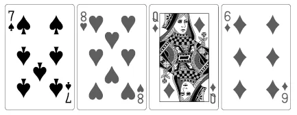 Так, в данном случае мы уже не можем говорить о том, что 7 Пик при Даме Бубен, в данном случае при Даме Бубен легли 8 Червей и 6 Бубен: