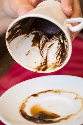 Выпив кофе, вы медленно поворачиваете чашку от себя, чтобы струйка гущи стекла к краю, противоположному тому, от которого вы пили. Потом снова к себе и кверху донышком ставите на блюдце. Через несколько минут, когда вода стечет и останется только полусухая гуща на стенках, можно начинать гадание.