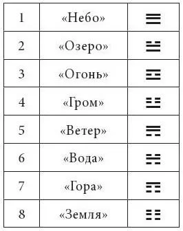 Например, если мы получаем в остатке 2 палочки и добавляем одну палочку из левой руки, суммарное число будет 3. Сверившись с таблицей, мы определяем, что наша внутренняя триграмма – «Огонь» ☲.