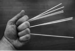 3. Одну палочку из правого пучка зажимаем между мизинцем и безымянным пальцем левой руки: