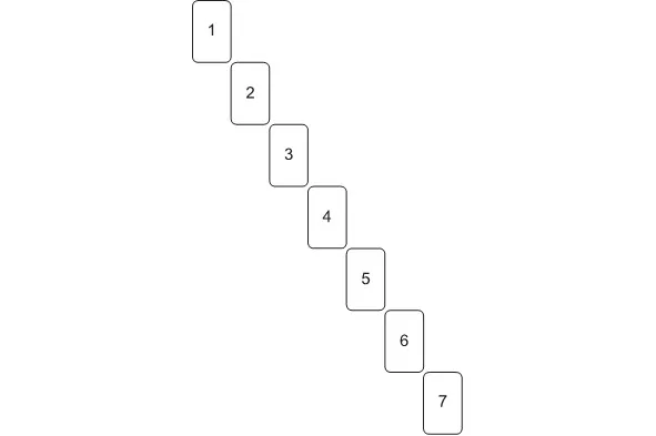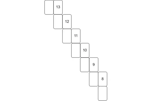 Перетасуйте колоду. Следующие шесть карт снимайте сверху колоды. Выкладывайте карты слева от первых семи карт сверху-вниз (карта под номером 14 окажется под первой картой). Последняя карта будет под номером 19.