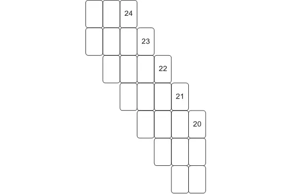 Вновь перетасуйте колоду и возьмите уже пять карт снизу колоды. Положите карту под номером 20 справа над картой номер 19. Выкладывайте карты снизу-вверх, пока карта под номером 24 не окажется над картой номер 13.
