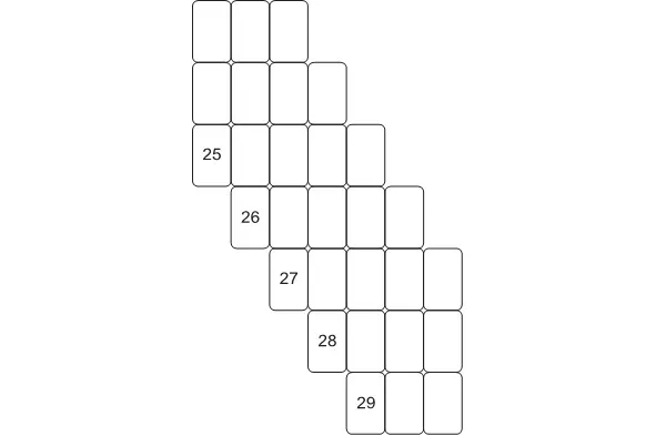 Вновь перетасуйте колоду и снимите пять карт сверху колоды. Выкладывайте карты по левому краю, согласно схеме сверху-вниз (от 25 до 29).