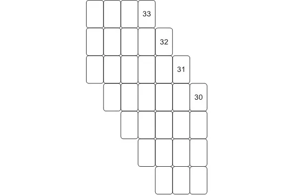 Перетасуйте колоду и снимите четыре карты снизу колоды. Выкладывайте карты снизу-вверх от карты под номером 30 до номера 33. В первоначальной инструкции говорится, что наш расклад должен быть похож на плиточный пол или потолок.