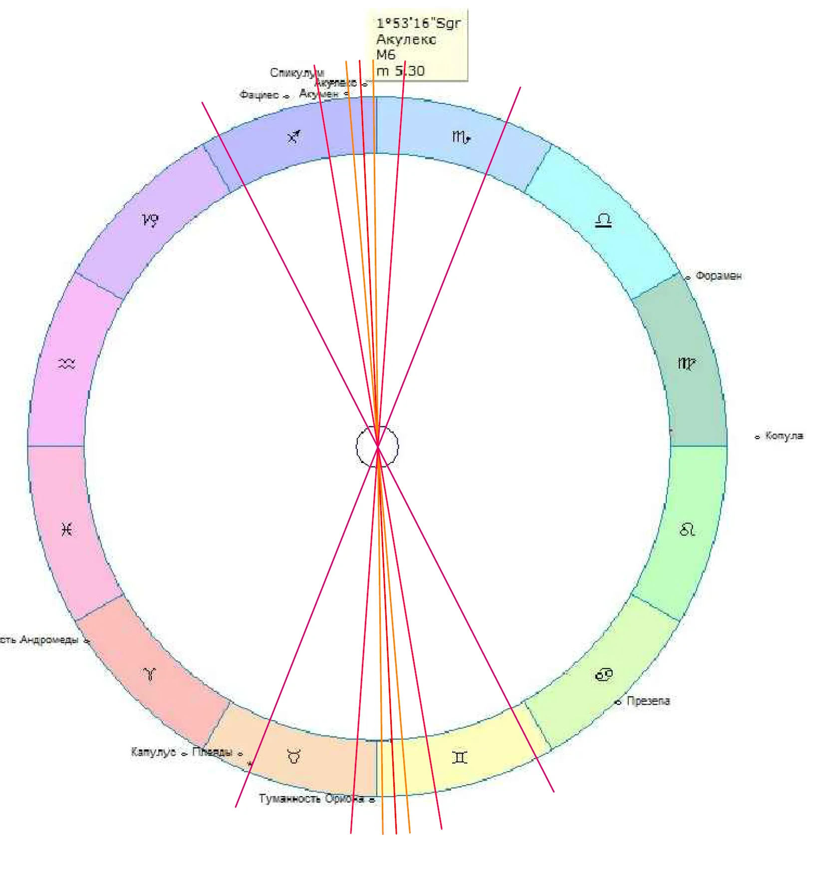 Одним из редких аспектов в Астрологии является соединение трех самых больших планет Солнечной системы. Причем точного соединения никогда не происходит, всегда имеется разбег в 1 – 2 градуса и больше. Но есть одно историческое событие, когда в ряд на линии близкой к галактическому центру выстроились Солнце, Луна, Юпитер, Сатурн и это произошло 18 сентября 10532 года до нэ. Интервал соединения составил от 907/ до 11037/ созвездия Стрельца, или в 70 от Галактического центра. Такого построения с ГЦ так и не произошло за последние 12,5 тысяч лет, но об этом в другой главе.