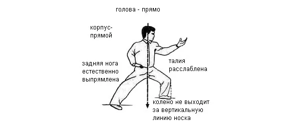 Обратить внимание: тело должно быть в вертикальном положении, плечи и локти опущены. Пальцы рук чуть согнуты. Вес тела равномерно распределен на обе ноги. При сгибании ног талия расслаблена, ягодицы слегка втянуты. Опускание рук должно координироваться со сгибанием ног.
