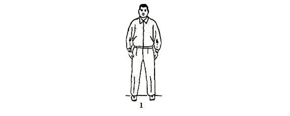 1. Встать прямо, ноги на ширине плеч. Пальцы ног направлены вперед, руки – в свободном состоянии. Смотреть перед собой.
