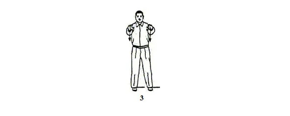 2. Медленно поднять руки перед собой до уровня плеч, ладонями вниз (рис. 2,3).