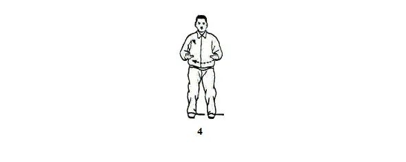 3. Одновременно с плавным движением кистей вниз чуть присесть. При этом движении рук локти свободно опускаются вниз. Смотреть перед собой (рис. 4).