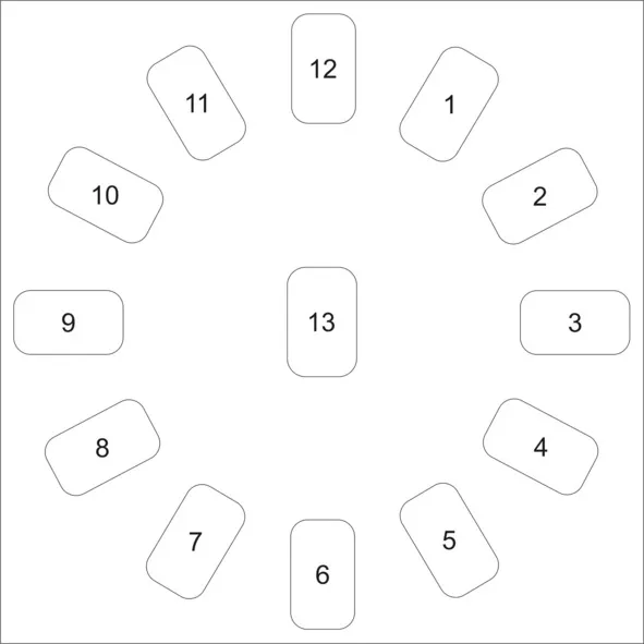 Итак, вечером под новый год перемешайте колоду. И разложите по кругу в том порядке, в котором указанно на рисунке.