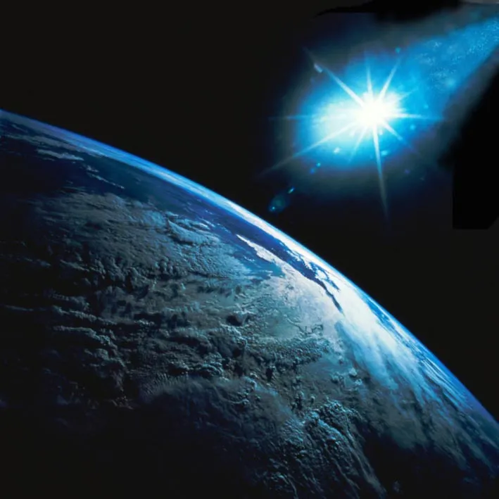 От огромной температуры пролетающего корабля загорались леса, а в озёрах и реках закипала вода, таяли снега и льды. Когда до столкновения с поверхностью, остались мгновенья, вдруг вокруг раскалённой махины появился голубой круг плазмы, с него, с шипением в сторону земли вырвалось голубое пламя, и корабль резко затормозил, как будто упёрся в невидимую стену. От небывалой температуры, вода в озере, что оказалось под нами, мгновенно закипела и рванулась в небо со страшным рёвом и грохотом. Берега озера затряслись от удара корабля об поверхность земли. Потревоженная атмосфера, разразилась небывалыми молниями и громом, пар, достигнув большой высоты, остыл и выпал сильным дождём, с градом и мокрым снегом. Вода и снег, стеной падала на землю, частично вновь испаряясь над упавшей с неба «Горой Света»