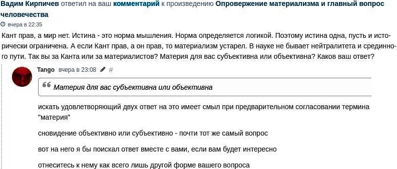 Для полноты картины покажу разговор с неким философом-идеалистом, написавшем три тома про то, что идеализм – это правильно, а материализм – не правильно.
