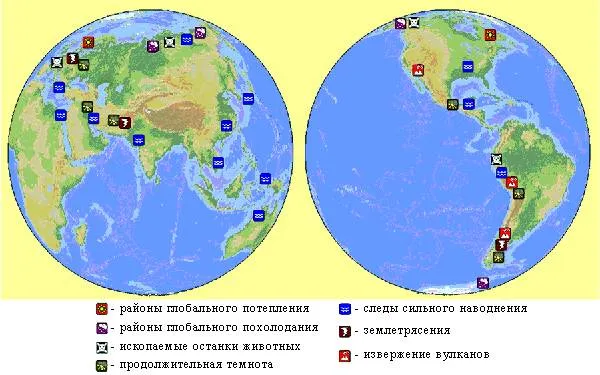 Однако накопленные современной наукой данные свидетельствуют также о том, что последствия катаклизма не ограничились «разовой» гибелью части живого. На этот же период времени приходится резкая смена климатических условий в различных регионах планеты.