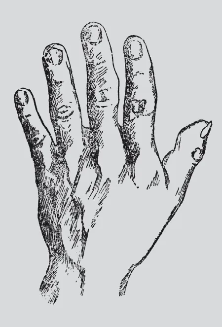 Изучим сперва элементарную руку (рис. 2). Груба в своих формах, словно не закончена. Ладонь преобладает. Производит впечатление грубого деревянного изделия, напоминая собою Аска – первого человека германских сказаний1. Преобладание ладони (palma) характеризует низкую ступень развития. Ладонь постепенно переходит в пальцы. Еще у обезьян ладонь образует наибольшую половину руки. Элементарная рука, аляповатая на вид, неуклюжая в своих движениях, всегда напоминает первобытное существо, жившее задолго до наших отдаленных предков. Такие руки были, наверное, свойственны первобытному человеку, жителю Неандерской долины. Эти короткие неуклюжие пальцы с тупыми концами говорят нам о неповоротливом, ленивом уме. Такие руки встречаются у всех диких народов, у которых лишь элементарные потребности кочевников или примитивных землепашцев. Но в большинстве они замечаются у людей, живущих под тяжелым социальным и моральным гнетом.