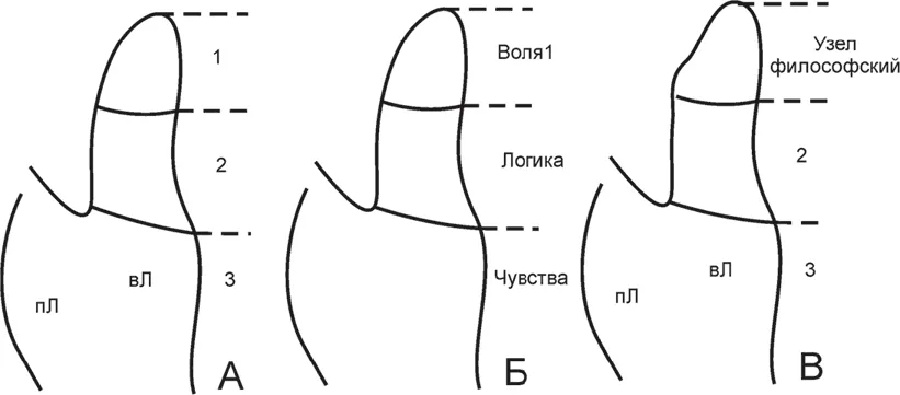 Сустав между 1-й и 2-й фалангами называется «первым узлом». Утолщенный первый узел называется «философским» (рис. 16-В). А. Дебарроль считает, что первая фаланга, имеющая философский сустав, приносит нам идеи. Человек с таким пальцем любит разбирать собственные идеи и идеи других, он недоверчив, скептик и любит умничать. Он ничему не верит и во всем сомневается. Эти негативные черты характера часто усилены, если вторая фаланга (ум, логика) у него короче первой. На работе и в семье о нем говорят «тяжелый человек».