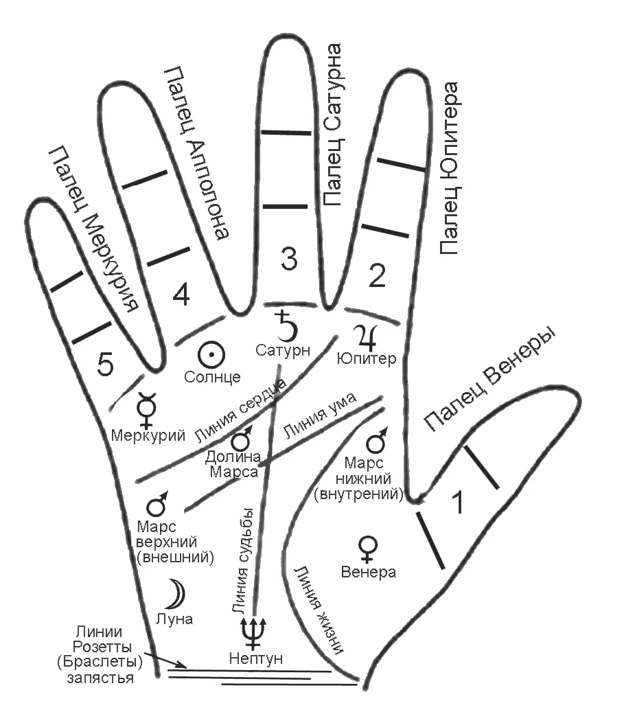 Пальцы и части ладони хироманты обозначали знаками Зодиака (рис. 17) – в зависимости от того, в какую зону деления ладони входили эти знаки Зодиака, это тоже имело влияние на истолковании.