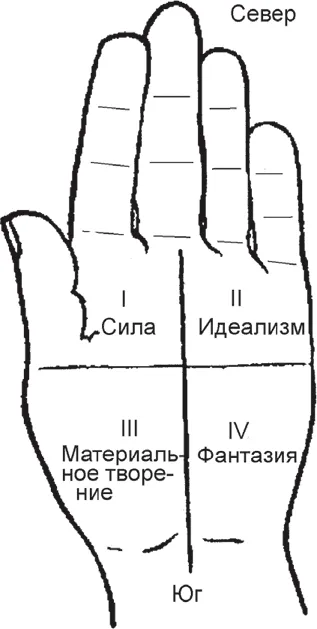 Ладонь делится также на 4 зоны (квадрата):
