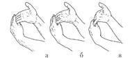 Рис. 1. Определение гибкости ладони: а – негибкая; б – нормальная; в – гибкая