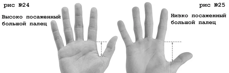Большой палец может находиться на разной высоте по отношению к ладони. Высоко посаженным большой палец считается тогда, когда он начинается высоко от запястья руки, то есть, когда он расположен ближе к пальцам. Люди с таким типом ладони открыты и приветливы, добры и дружелюбны, но несколько наивны.