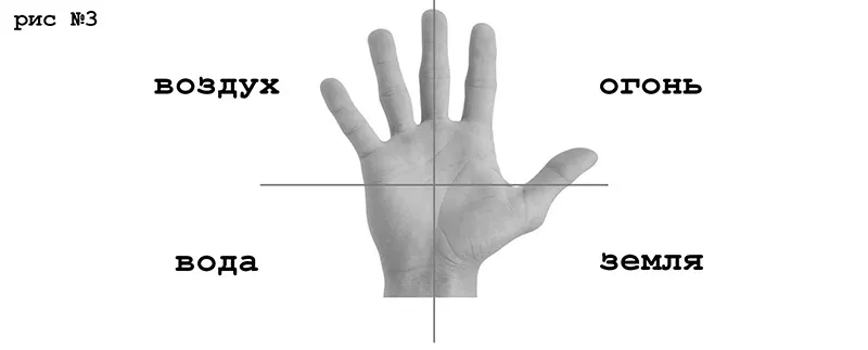 Поделив таким образом ладонь на четыре части, вы и получите искомые квадранты, каждый из которых представляет одну из известных всем стихий: Воздух, Огонь, Воду и Землю.