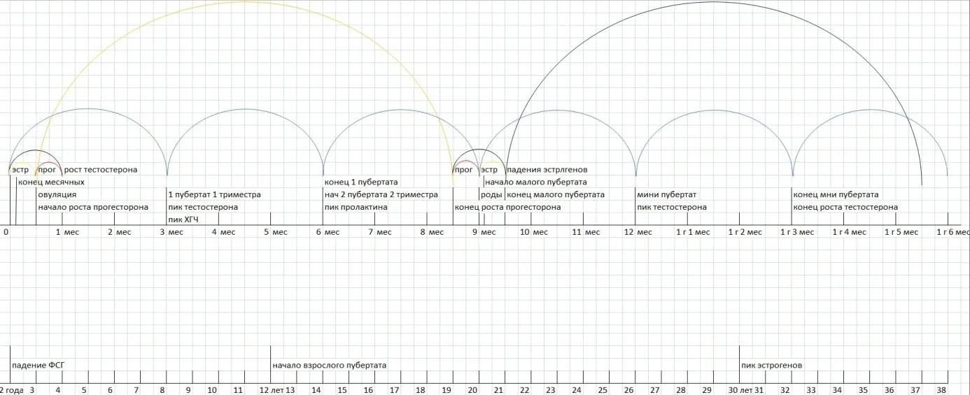 Далее следует обсудить триместры и включить их в наш график. Каждый триместр характеризуется определёнными гормональными всплесками, такими как рост ХГЧ и тестостерона в первом триместре, а также увеличение пролактина во втором.