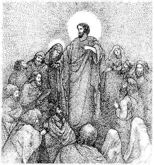 Иисус со своими учениками. Среди учеников Дева Мария, Его Мать, и Мария Магдалина. Рисунок Лу Локарда