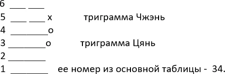 Не убирая далеко основную таблицу триграмм, мы находим вплетенную триграмму, состоящую из внутренних черт основной триграммы, она позволит узнать нам о самом процессе ремонта, как он будет проходить, прежде чем будет получен итоговый результат в гексаграмме 34. Вспоминайте, мы рисуем (с низа в вверх) 2, 3,4,3.4,5 черты 34-ой гексаграммы.