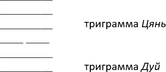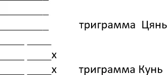 Находим номер гексаграммы: № 10 – «Наступление», «Осторожная поступь». Это итоговая гексаграмма, а теперь построим промежуточную, состоящую из внутренних черт гексаграммы № 12: