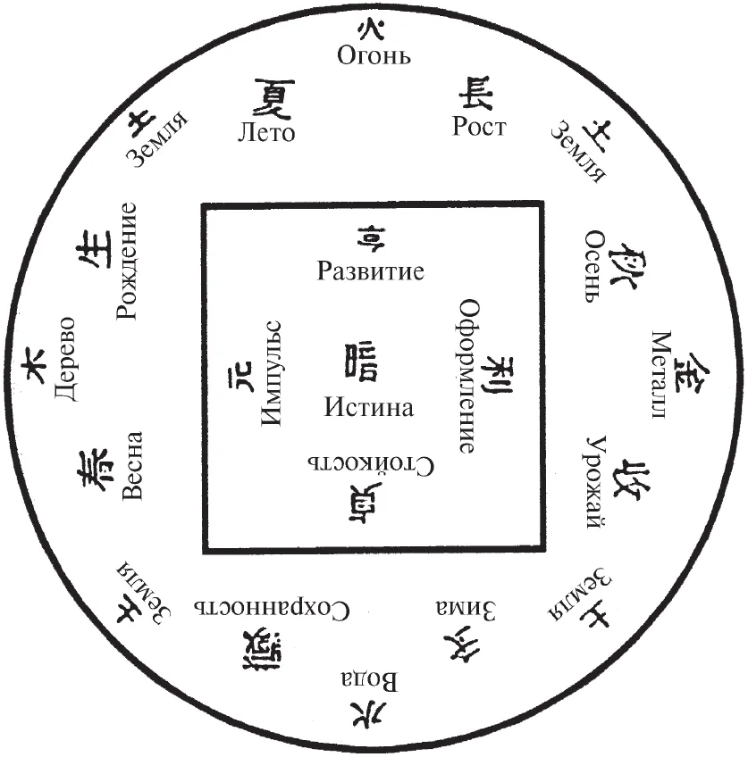В комментаторской литературе существуют две системы объяснения этих терминов. Одни комментаторы (например, Чжу Си) формулу из четырех знаков юань-хэн ли-чжэн сочетают попарно и, связывая их с названием гексаграммы в целое предложение, полагают, что это два сказуемых к общему подлежащему – названию гексаграммы. В таком случае получается фраза цянь юань хэн ли чжэн, которую (принимая во внимание глоссы Чжу Си) следует перевести так: «Творческое Небо есть великое всепроницание и должная непоколебимость». Однако с таким пониманием трудно согласиться, так как слишком развитая в грамматическом отношении конструкция вряд ли возможна в таком архаическом тексте118. Другие комментаторы (например, Чэн И-чуань, продолжающий в этом отношении традицию Ван Би и комментария «Вэнь-янь-чжуань», а также и маньчжурский перевод «Ицзина» «Хани араха убалямбуха чжичжунга номунь») рассматривают эти четыре слова как отдельные, не связанные в контекст фразы. Это, полагают они, лишь перечисление четырех качеств творчества. Исходя из этой традиции, японский философ Кумадзава Бандзан (1619–1692) создал даже целую теорию о космическом проявлении этих четырех качеств творчества. Он приводит следующую схему своей космогонии (см. рис.).