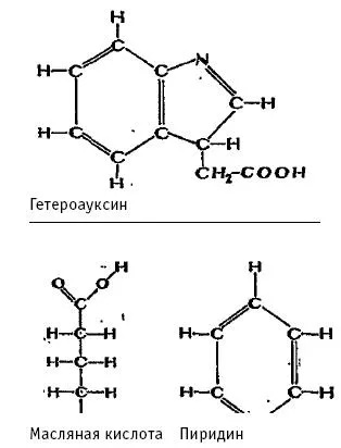 Примеры молекулярной структуры, чтобы проиллюстрировать, какие формы она может принимать (на самом деле известны сотни тысяч разных соединений углерода, каждое – с собственным расположением атомов). Здесь наблюдатель перемещается по областям, где прямое видение должно уступить место более окольным методам. Электронный микроскоп, который хотя теоретически и может показывать наиболее крупные атомы, на самом деле еще не может проникать так далеко; однако при помощи рентгена можно фактически сделать фотографию структуры молекулы. И эти фотографии показывают, что диаграммы химика (из которых я привожу всего три примера), в принципе, достоверны. На самом деле химик – это молекулярный архитектор, знакомый с теми правилами планировки, которые позволяют ему сооружать бесчисленные структуры, неизвестные в природе.