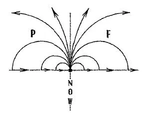 Конечно, я привык видеть в прошлом не такой мир-бессмыслицу, все ценности которого перевернуты вверх дном. Тогда как именно я вспоминаю о прошлом? Я совершаю серию прыжков назад. Я, скорее, «мысленно бросаюсь» в прошлое, чем планомерно продвигаюсь к некому прошлому событию. Вспоминать о прошлом – значит не столько бежать вниз по восходящему эскалатору, сколько прыгать по нему, перемахивая несколько ступеней за раз и останавливаясь, чтобы восстановить дыхание. Или (возьмем другую метафору) представьте, будто рыба движется вверх по реке, не противостоя течению: она не плывет против него, но вместо этого выпрыгивает из воды, некоторое время дрейфует по течению, а затем прыгает вновь. Таким манером, то ныряя во время, то взмывая над ним, она приходит к истоку, хотя не сопротивляется волнам. Обращение к будущему во многом происходит так же: я живу в потоке и парю над ним. Находясь внутри него, я подчиняюсь его ходу; будучи над ним, я свободен в своем движении. И все свои вылазки я совершаю из этого центрального Теперь, которое находится между истоком реки и ее устьем. Это моя опора, и линии моего взаимодействия всегда проходят через нее. В каком-то смысле я никогда не покидаю ее, но лишь отправляю наружу проекции.