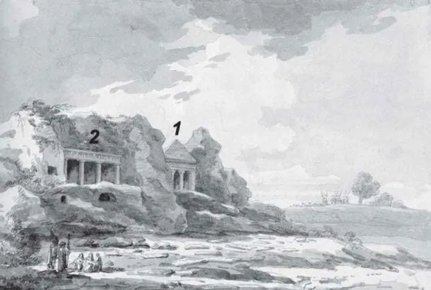 Рис. 3. Долина Кидрона. ГТГ, инв. 6491. Воробьев изображает проход между колоннами фасада «гробницы Захарии» (цифра 2 на рисунке), очевидно по аналогии с соседней гробницей священнического рода Хезир (цифра 1 на рисунке) На самом деле, «гробница Захарии» вырублена из скального монолита и имеет декоративные полуколонны на фасаде, но никакого прохода между ними нет.