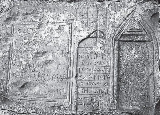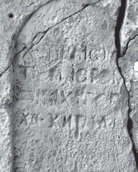 Вот плита, сохранившаяся не полностью, но можно разобрать: Х ТИМО – ходжа Тимофей; ТО ИЕРО – священник? Иеромонах? Или речь о том, что пришли в монастырь (это с учетом, что текст может быть не славянский, а греческий)? И внизу ХО: КИРИЛЛ – это тоже понятно: ходжа Кирилл.