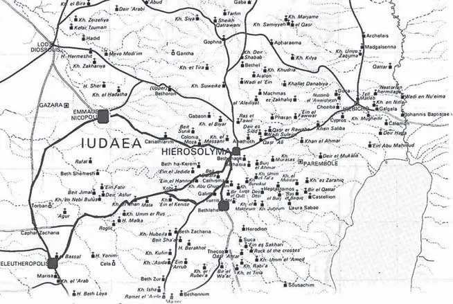 Развитие Иудейской равнины напрямую было связано с развитием трех главных городов: Иерусалима, Эммауса – Никополиса и Бейт-Гуврина – Элевферополя (см. план 2). Иерусалим, неразрывно связанный с областью Иудейской равнины, и во многом определяющий ее развитие, в данной статье обсуждаться не будет.