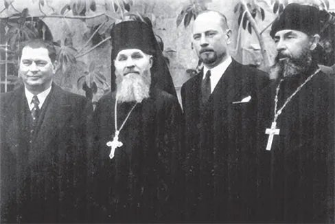 Слева направо: мэр Иерусалима Д. Остер, архим. Леонид (Лобачев), посол СССР в Израиле П. И. Ершов, протоиерей Владимир Елховский. Иерусалим 1949 г.