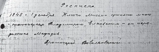 Расписка: «1948 г. 1 декабря. Ключи Миссии приняты мною протоиереем Владимиром Елховским от иеродиакона Мефодия. Протоиерей Елховский».