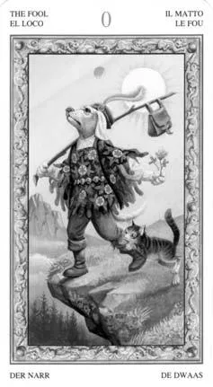 Картинка аркана разделена на две части: мир над пропастью, залитый солнечным светом. В нем находится пес – странник. И – пропасть, находящаяся в тени. Мир тени затянут туманом, олицетворяющим неизвестность, тайну, а также скрытые ловушки. Это говорит о том, что пока не ясно, как сложится дальнейшее путешествие песика – странника, и что его ждет дальше.