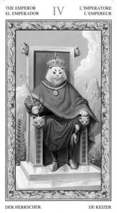 На троне, стоящем на мраморном возвышении, сидит Кот – Император. Его голову украшает корона. В правой лапе он держит скипетр.
