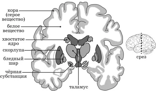 Рисунок 5.0510. Базальные ядра (хвостатое ядро, скорлупа,бледный шар, чёрная субстанция) и кора головного мозга