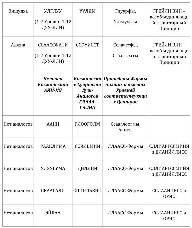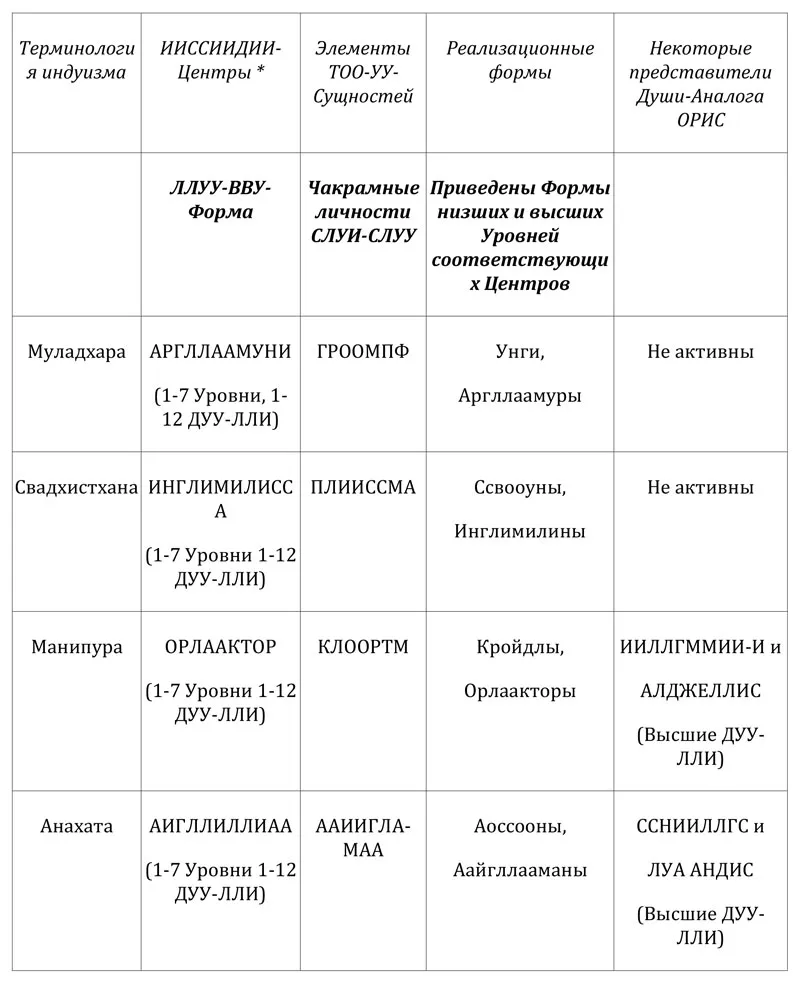 * ИИССИИДИ-Центры можно поставить в соответствие с представлениями индуизма о «чакрах» лишь с очень большой долей условности, поскольку ИИССИИДИ представляет собой вовсе не трёхмерную структуру точечных центров психической концентрации в человеке, а глобальную систему космических взаимосвязей…