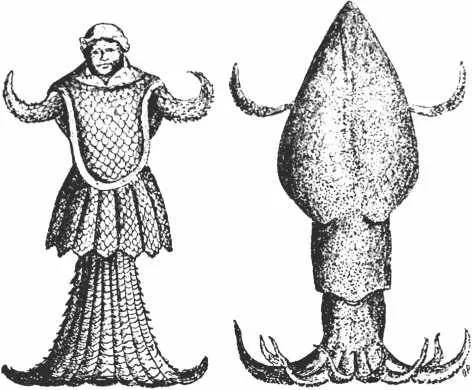 Приведу еще пример из более близкого времени; я говорю о знаменитом «морском монахе». Мы имеем не только описание этого чудовища, но даже изображения, которые, конечно, скорее всего помогут нам выяснить, где именно кроются ошибки наблюдения. Самое древнее известное мне описание встречается у немецкого натуралиста Конрада Мегенберга, написавшего в 1349 г. первую немецкую естественную историю «Das Buck der Natur»; но его сочинение есть только обработка еще более древнего латинского оригинала «Liber de natura rerum» Фомы Кантимпратензиса (1270). Последнее не было напечатано и имеется только в немногих рукописях, которых мне не удалось видеть, вероятно и у него уже есть это описание морского монаха. Изложение Конрада Мегенберга настолько характерно, что заслуживает дословной передачи: «Monachus marinus. Морским монахом называется чудовище в образе рыбы, а верх, как у человека; оно имеет голову, как у вновь постриженного монаха. На голове у него чешуя, а вокруг головы черный обруч выше ушей; обруч состоит из волос, как у настоящего монаха. Чудовище имеет обычай приманивать людей к морскому берегу, делая разные прыжки, и когда видит, что люди радуются, глядя на его игру, то оно еще веселее бросается в разные стороны; когда же может схватить человека, то тащит его в воду и пожирает. Оно имеет лицо, не совсем сходное с человеком: рыбий нос и рот очень близко возле носа». Мы знаем теперь, что подобное чудовище действительно существует. Экземпляр его был пойман возле Малмье между 1545–1550 годами. Датский историк Арильд Хвитфельд сообщает в «Хронике Датского королевства» следующее: «В 1550 году поймана возле Орезунда и послана королю в Копенгаген необыкновенная рыба. У нее была человечья голова, а на голове монашеская тонзура. Одета она чешуями и как бы монашеским капюшоном. Король велел рыбу эту похоронить. С рыбы было сделано несколько рисунков, которые были посланы разным коронованным лицам и натуралистам Европы». Эти-то рисунки и дошли до нас. Известный врач и натуралист Конрад Геснер в Цюрихе (1516–1665) пишет по поводу этого чудовища: «Этот морской монах, говорят, пойман был в Балтийском море, возле города Элбъе в 4 милях от Копенгагена, столицы Датского королевства. Длина рыбы четыре локтя; она была прислана королю и считается за чудо. Говорят, она была поймана в сети вместе с селедками. Альберту с пишет, что такие же рыбы неоднократно бывали пойманы в Британском море».