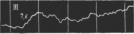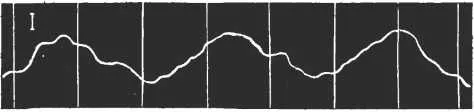 Было уже ранее сказано, что при этом аппарате дрожания по всем трем измерениям записываются на одной кривой. Пуговка к при движениях направо и налево, взад и вперед имеет очень незначительное движение, но при дрожаниях вверх и вниз делает гораздо большие колебания, что ясно отражается на записываемых кривых. Самые крупные колебания при всех этих опытах зависят прежде всего от дыхания, так как рука следует за движением грудной клетки. Рис. 67 показывает кривую такого происхождения. При нормальном состоянии человек делает одно дыхание в промежутке 3–5 секунд.