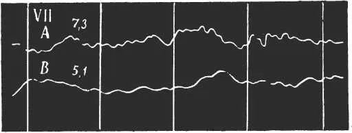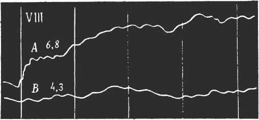 Казалось бы, вероятнее было допустить, что когда за столом сидят несколько лиц и каждое из них сообщает столу ряд мелких толчков, то эффект их будет взаимно уничтожаться и стол останется в покое, чем что толчки непременно должны суммироваться. Конечно, стол может прийти в движение только в том случае, если все слагающие импульсы будут происходить одновременно и в одном направлении. Маленький ребенок, рядом ничтожных подергиваний за канат, может привести в движение тысячефунтовый церковный колокол, но для этого толчки должны быть часты и следовать в одном направлении. Из опыта известно, что столоверчение не всегда удается; следовательно, успех попытки зависит от каких-то особых обстоятельств. Для выяснения всего этого я, при самых разнообразных обстоятельствах, записал движения рук участников сеансов, как до наступления движений стола, так и во время их. Мне кажется, что полученные при этих опытах кривые могут разрешить вопрос.