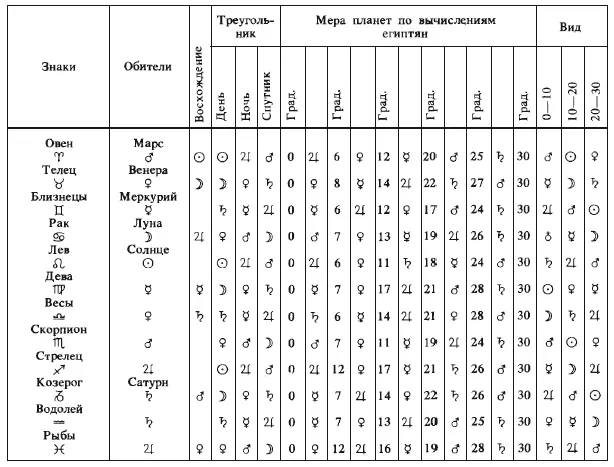 В первой рубрике отмечены 12 знаков зодиака; в ближайших рубриках обозначено, какая планета имеет в данном небесном знаке свою обитель, восход, треугольник, меру и вид. Каждый треугольник, куда вступает небесный знак, имеет трех повелителей; один из них господствует днем, другой ночью и третий есть спутник. В графе «мера планет» всякая планета стоит между двумя числами, которые определяют пределы ее господства. В графе «вида» даны три планеты; так как первая господствует в первых десяти градусах знака, вторая в пределах от 10 до 20° и третья от 20 до 30°.