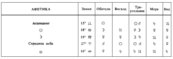 Мы начнем с асцендента; гороскоп показывает, что 15° ♌ находится в асценденте. Из вышеприведенной таблицы видно, что знак Льва есть обитель для ☉; ни одна из планет не находится в восхождении; в треугольнике господствует Солнце (так как в данный момент – день), а ♂ есть спутник. В ♂ 15° Льва Сатурн имеет свою меру, а ♃ свой вид. Точно так же и в других гилегиальных пунктах. ☉ стоит в 18° ♋; здесь же Луна имеет свою обитель, ♃ – свое восхождение и т. д. Таким образом получается следующая таблица для приведенного гороскопа.