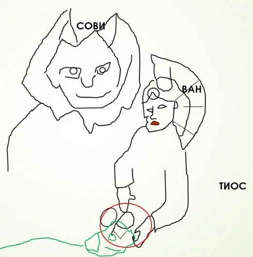 Воин в шлеме римских легионеров держит в руках шар, на котором написано «обр» (дух), под шаром лежит больной с повязкой, как носят сейчас марлевые. Выше – образ совы, как символ смерти. Сову связывают с потусторонним миром. Не лишена эта птица и демонических свойств, с ней ассоциируется негативная энергетика. Если ее заметили возле дома болеющего человека, то вскоре нужно ожидать его смерть (сайт «Про амулеты»). Как раз лежащий внизу человек с повязкой, скорее всего, умер, а дух стал кочующим эфирным шаром, который запечатлела фотография.